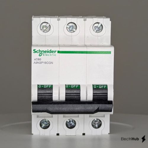 Schneider Electric A9N3P16CGN - This Acti9 xC60 is a low voltage biconnect miniature circuit breaker (MCB). It is a 3P circuit breaker with 3 protected poles and 16A In rated current with D tripping curve. The rated short circuit breaking capacity is up to 10000A ... View More
