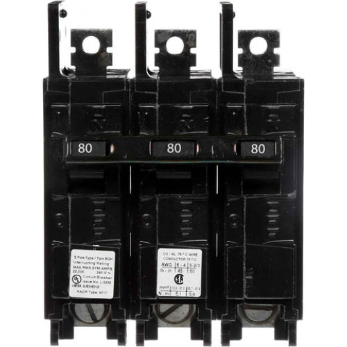 BQ3B080H Bolt - On Molded Case Circuit Breaker Siemens BQ series three pole three phase 80 ampere bolt - on molded case circuit breaker with maximum voltage rating of 240V tripping method thermal magnetic and high interrupting rating of 10 kiloampere at 240V functions long - time and ... - Siemens