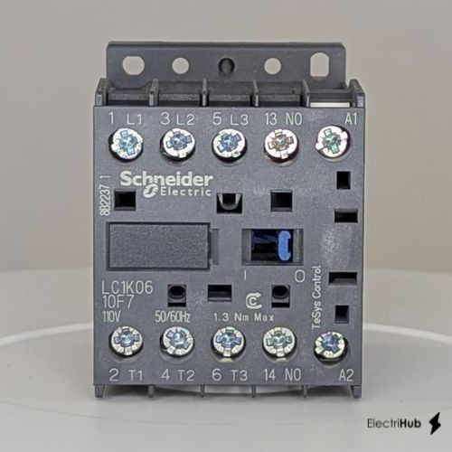Tags: LC1K0610F7 Contactor, TeSys K, 3P, AC-3, lt or eq to 440V 6A, 1 NO aux., 110VAC coil, LC1K0610F7 Schneider Electric, electrihub, electrical-supplies, electrical-supply-store, LC1K0610F7 Contactor, LC1K0610F7 LC1K