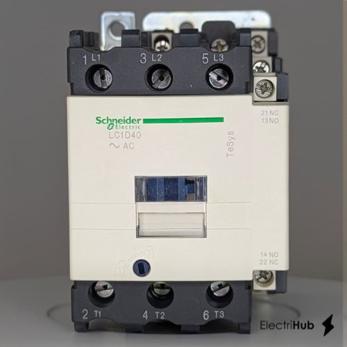 Tags: LC1D40M7 IEC contactor, TeSys D, nonreversing, 40A, 30HP at 480VAC, up to 100kA SCCR, 3 phase, 3 NO, 220VAC 50/60Hz coil, open, LC1D40M7 Schneider Electricelectrihub, electrical-supplies, electrical-supply-store, LC1D40M7 contactor