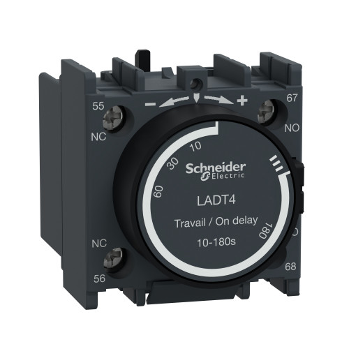Schneider Electric LADT4 - TeSys D time delay auxiliary contact block, for contactors LC1D, LC1F and control relays CAD,It provides 1NO+1NC contacts rated up to 10A 690V AC, On-delay setting range 10-180s, connection by screw clamp terminals,Clip-on front mounting, it procures high reliability and durability,Multi standards ... View More