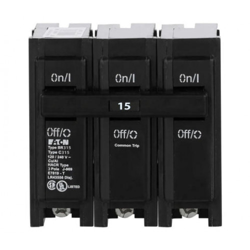 Eaton BR315 - BR thermal magnetic circuit breaker,Type BR 1-Inch plug-on circuit breaker,15 A,10 kAIC,Three-pole,240V,BR,Common breaker trip,#14-4 AWG Cu/Al,Q28,BR,Type BR Loadcenters