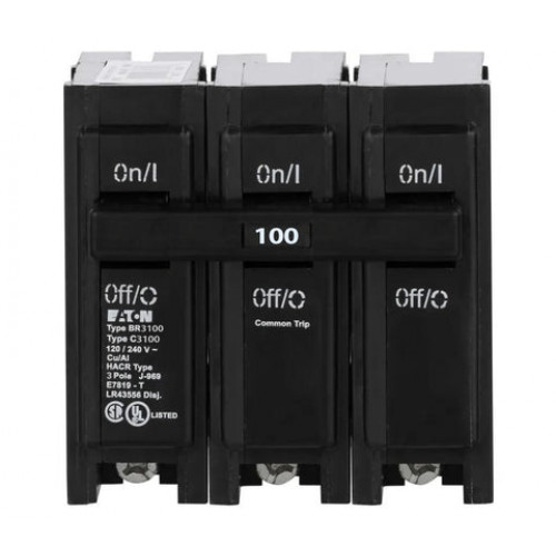 Eaton BR3100 - BR thermal magnetic circuit breaker,Type BR 1-Inch plug-on circuit breaker,100 A,10 kAIC,Three-pole,120/240V,BR,Common breaker trip,#1 AWG Cu/Al,Q28,BR,Type BR Loadcenters