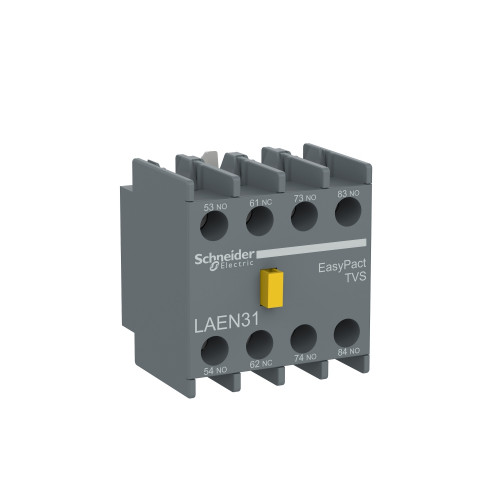 Schneider Electric LAEN40 - Add-on auxiliary contact block for EasyPact TVS LC1E contactors,It provides 2NO+2NC instantaneous contacts rated up to 10A 690V AC, connected by screw clamps terminals,It can be used in safety applications thanks to its NC certified mirror contacts,Easy to mount on front by ... View More